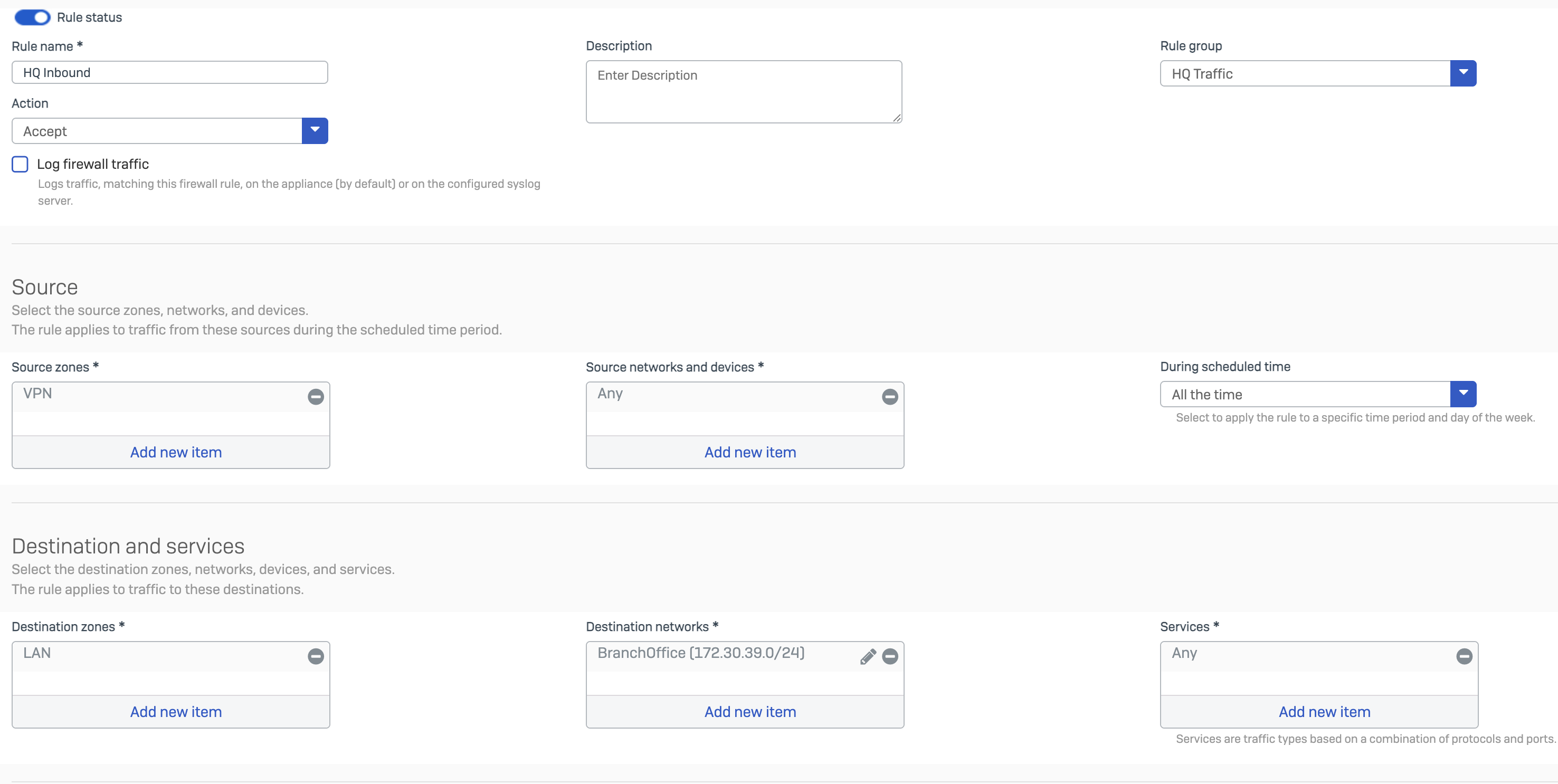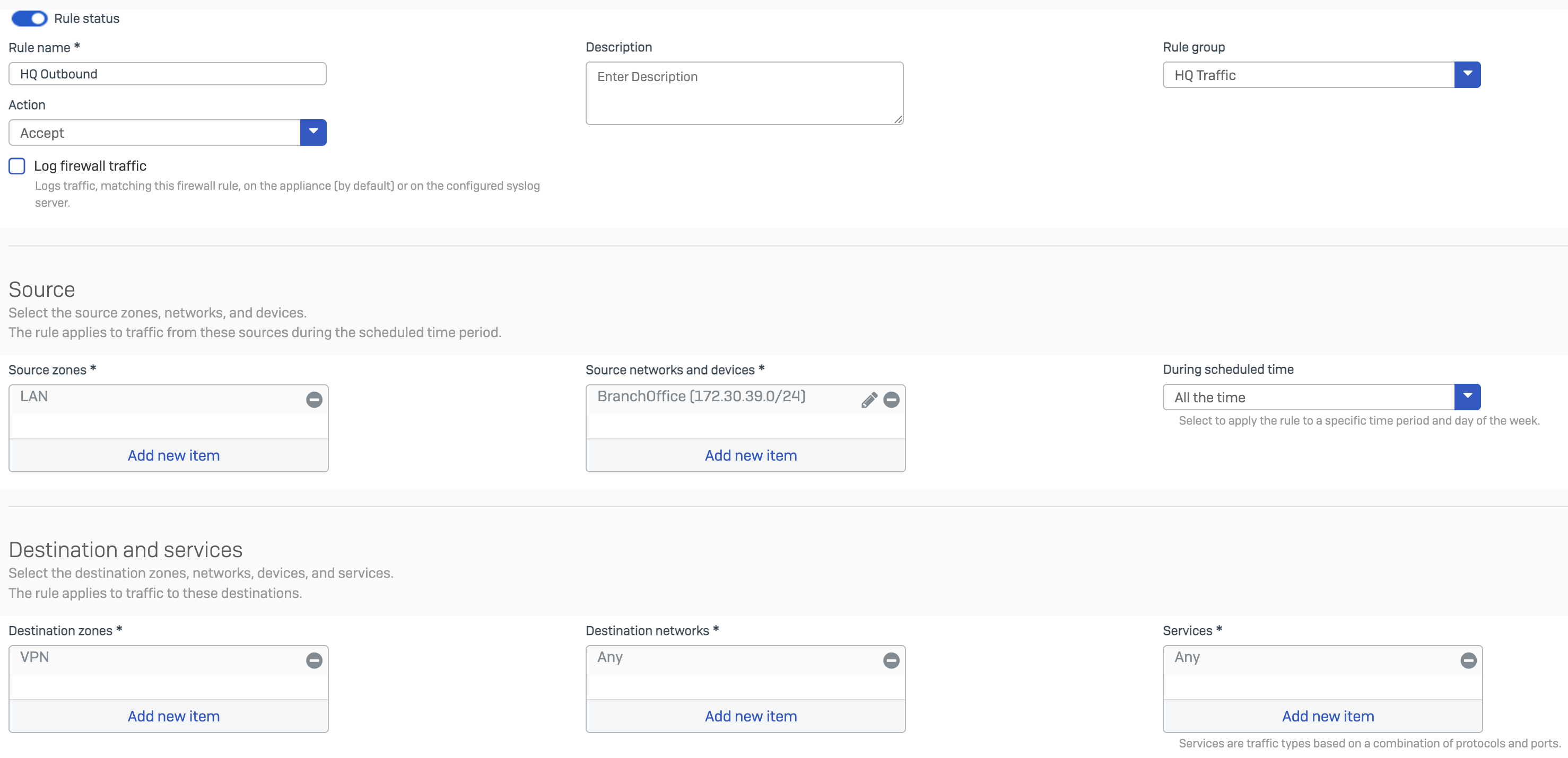 Define a firewall rule to allow outbound traffic originating from the Branch Office subnet 172.30.39.0/24 towards the Head Office network. This rule enables inter-site communication over the IPsec VPN tunnel and ensures proper routing of internal services such as DHCP, DNS, or centralized internet breakout.