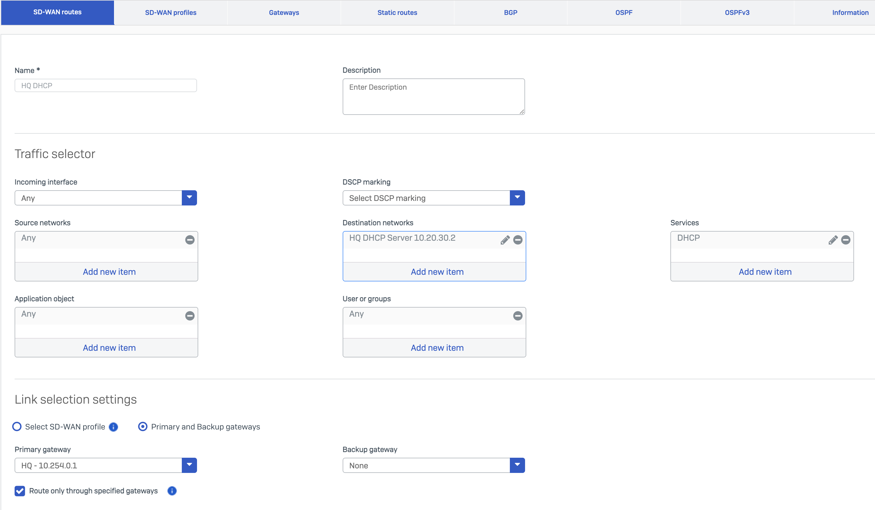 I will configure two SD-WAN routes on the HQ firewall. The first route will direct traffic from the internal DHCP server to the Branch Office firewall. The second route (optional) will route internet-bound traffic destined for the Branch Office network. This setup is intended to enable centralized internet breakout, allowing Branch Office traffic to be backhauled through the HQ firewall for internet access.